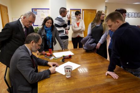 Присутствующие гости и студенты переходили от одного художника к другому, смотрели за их работой и знакомились с выставкой, задавая вопросы всем организаторам.