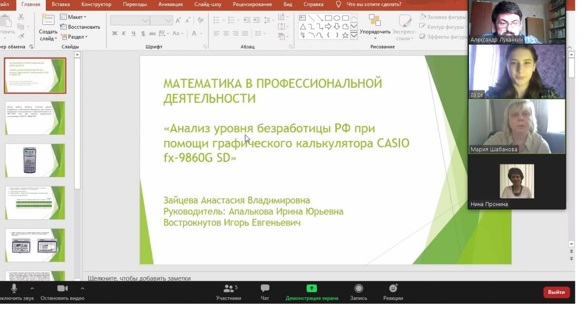 В секции «Использование математических методов при решении профессионально ориентированных задач» работа студентки группы 16ЭБЗО нашего института Зайцевой Анастасии «Анализ уровня безработицы в РФ при помощи графического калькулятора CASIO fx-9860GSD» (научные руководители: к.э.н., доц. Апалькова И.Ю., д.п.н., проф. Вострокнутов И.Е.) была удостоена бронзовой медали.