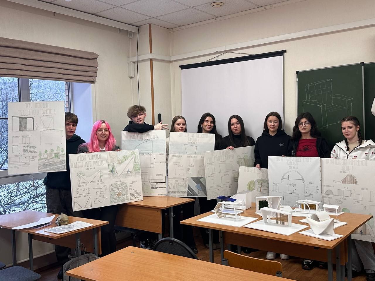 Студенты под руководством преподавателя Новиковой Д.М. разрабатывали проект остановок, полностью придумывая форму, материал, дизайн.